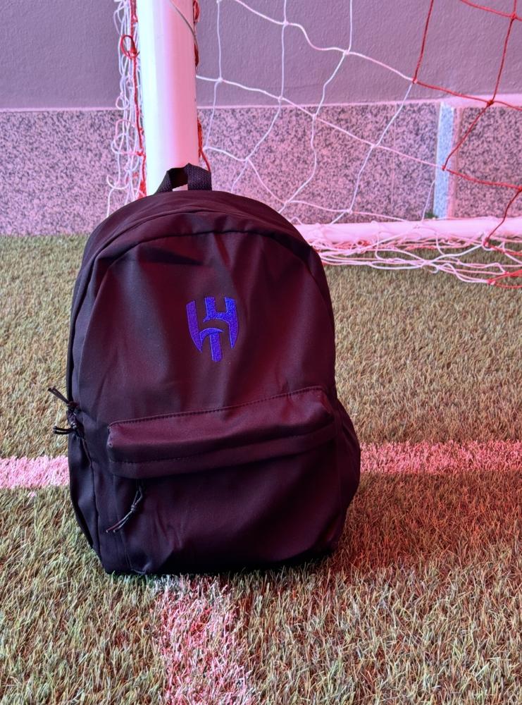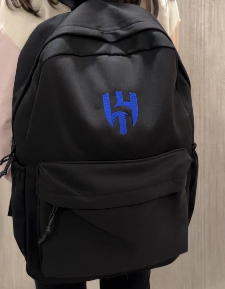 شنطة ظهر عملية باللون الاسودمطرزة بتصميم الهلال باللون الأزرق نوع القماش قطن مبطن بالنايلون